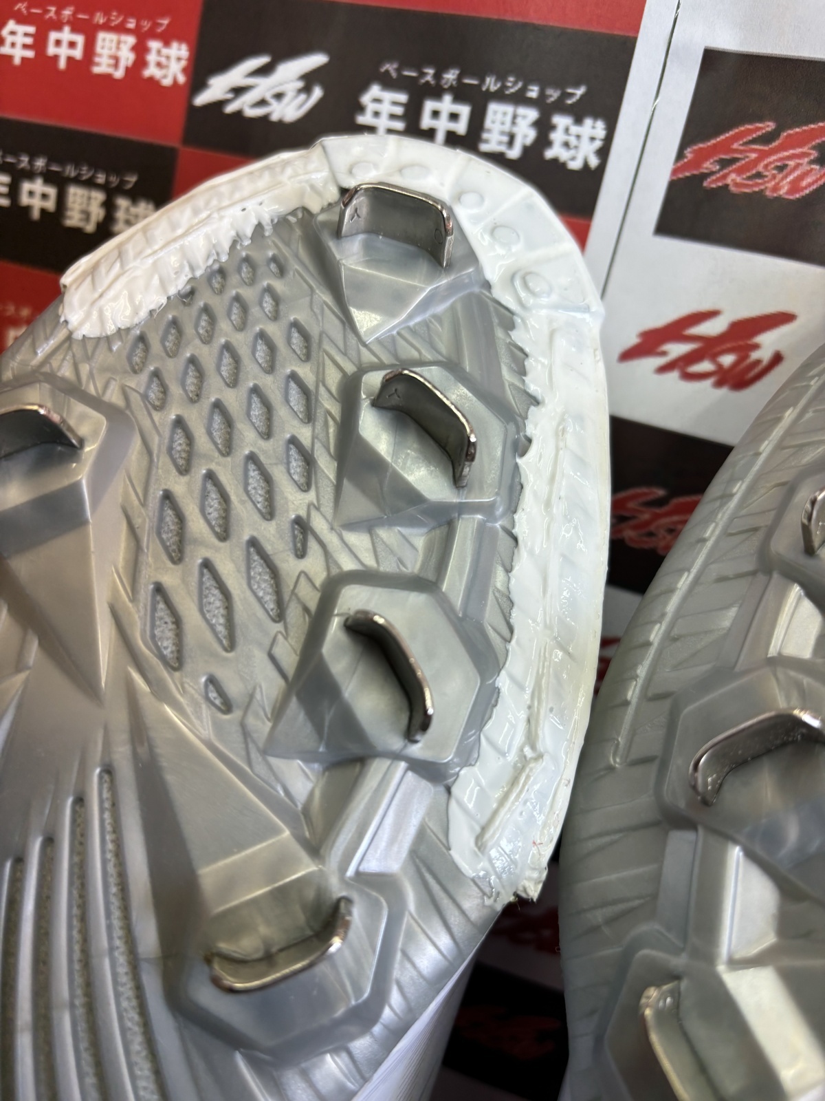 スパイクのP革加工には色々な取付方法がありますが、今回のがプロ野球選手が使用する場合の一枚革手縫いP革です!