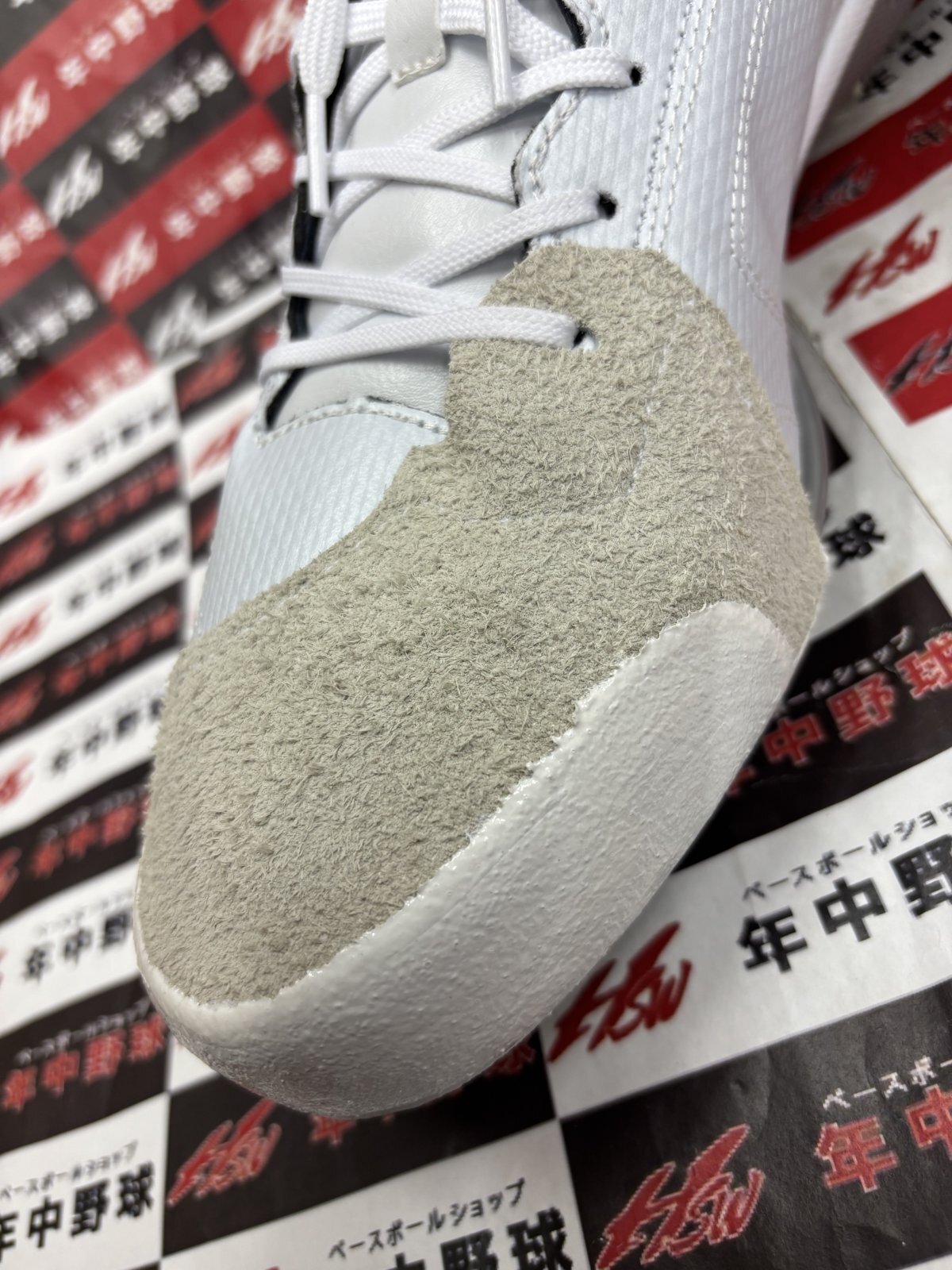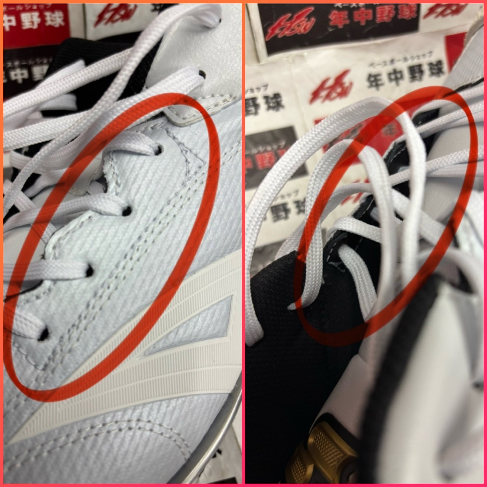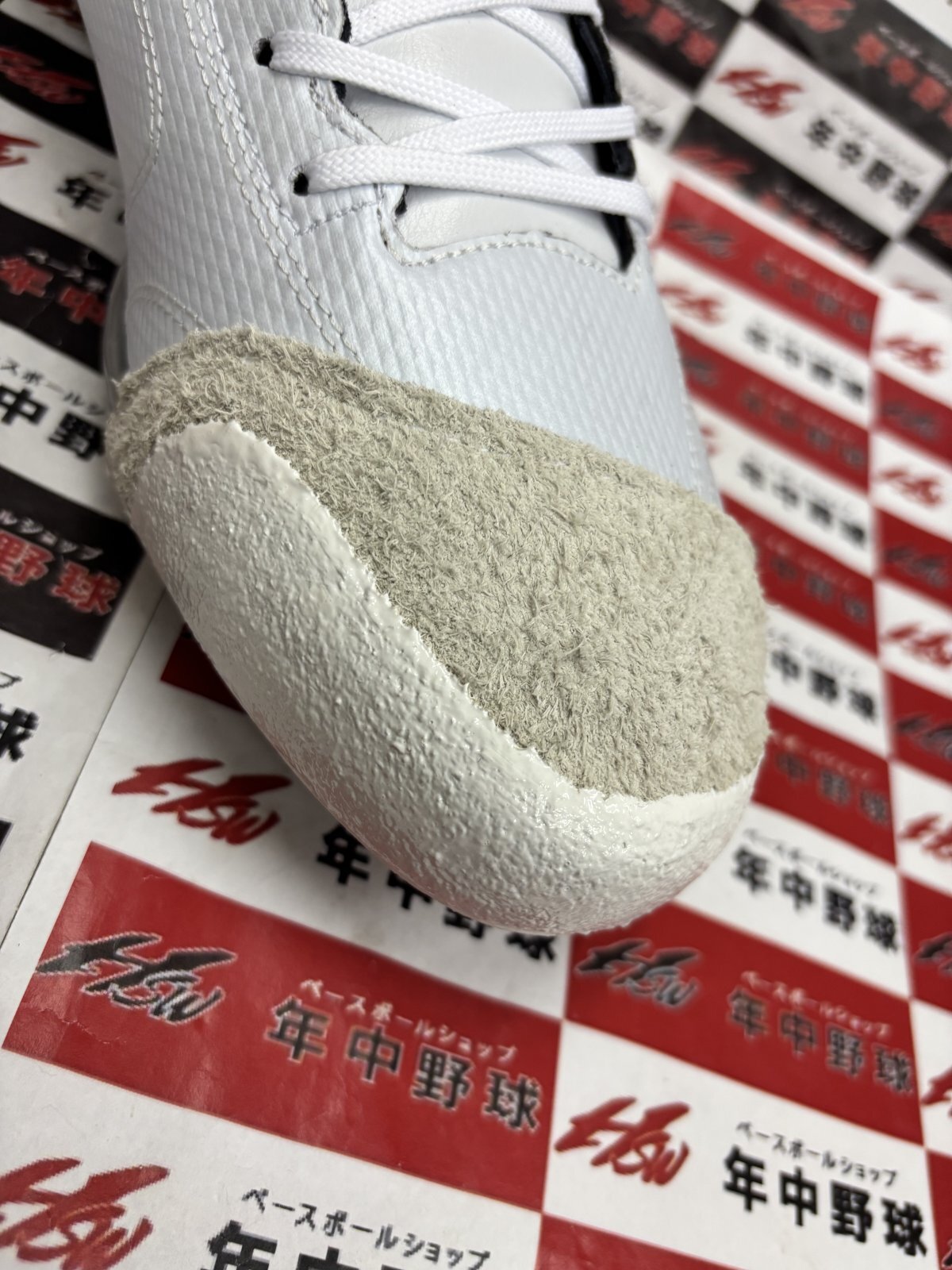 右足に投手用の大きめの縫いP、左足に野手用の小さめの縫いP、そして、紐を通す穴が裂けない様に裏側から薄皮を当てて補強しました!
