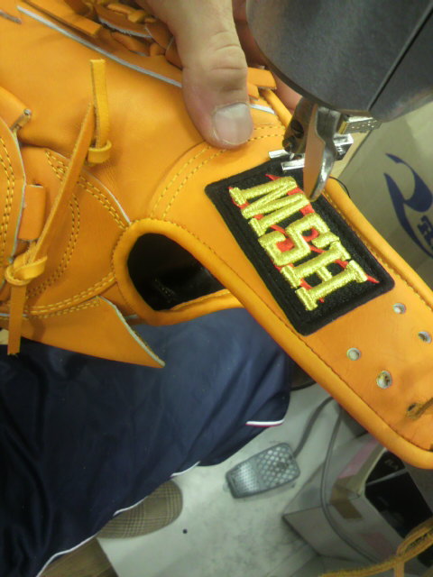 今日の写真は『ライナーバックの王冠タイプのラベル直刺繍』です。しかも縦とじです。玄人好みのグローブの完成です。綺麗なレモン色のグローブなので、湯揉み型付けのにじみが残りますが、自然風化していきます。