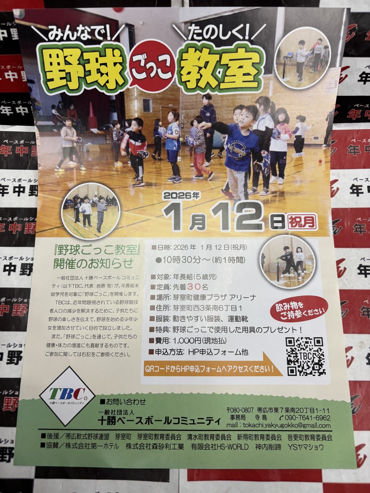 ちびっ子を対象とした『十勝ベースボールコミュニティ』の「野球ごっこ西部十勝編」を、来年の1月12日に芽室町健康プラザにて開催します!
