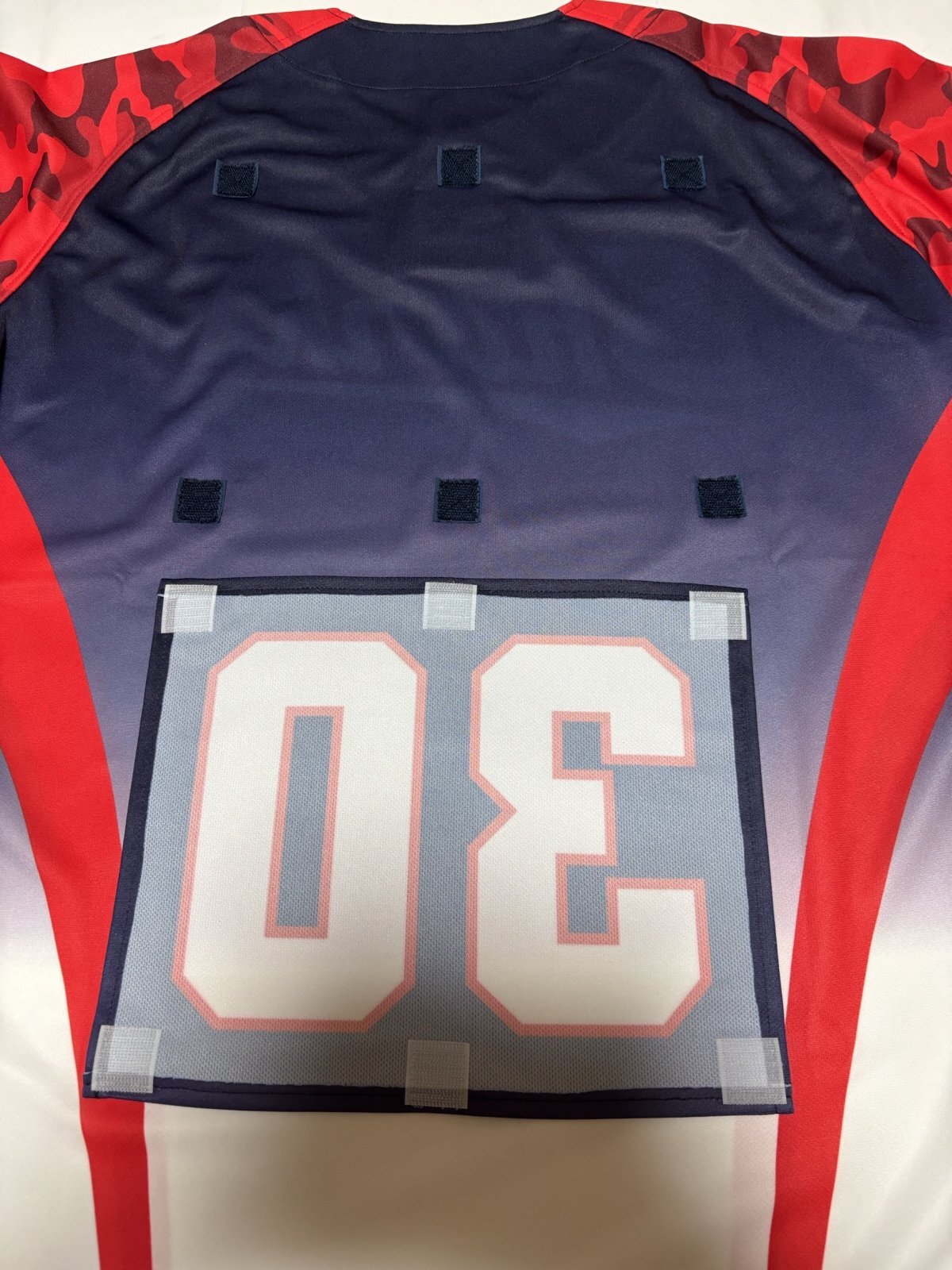 ゼッケン(背番号)は縫い付けではなく、マジックテープ加工にて作られせいただきました。